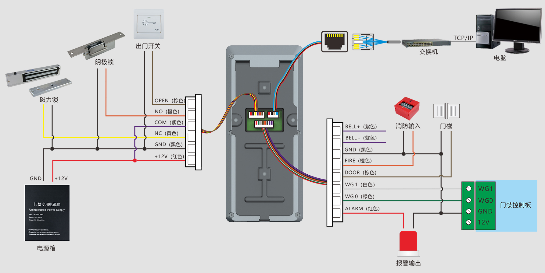 出门开关×1、门磁接口×1、报警输出×1、Wiegand输出×1、门锁控制×1