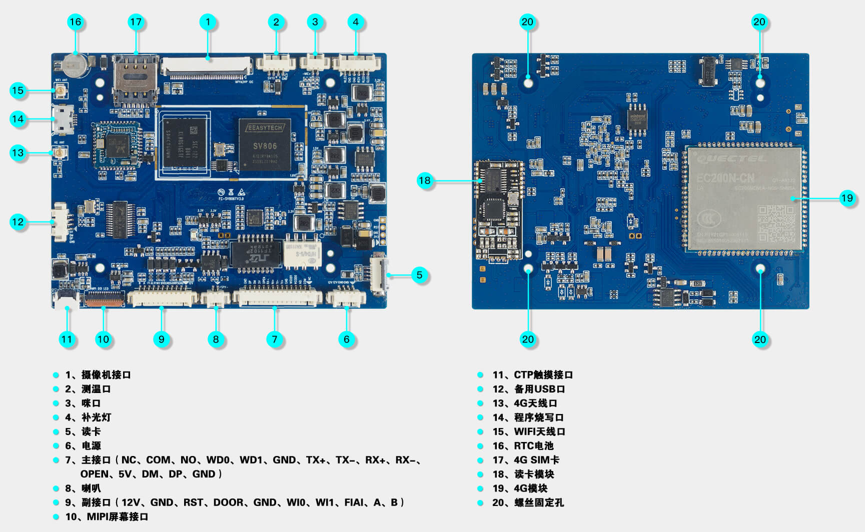 出门开关×1、门磁接口×1、消防输入×1、报警输出×1、Wiegand输出×1、Wiegand输入×1、门锁控制×1、USB×1、RS485×1