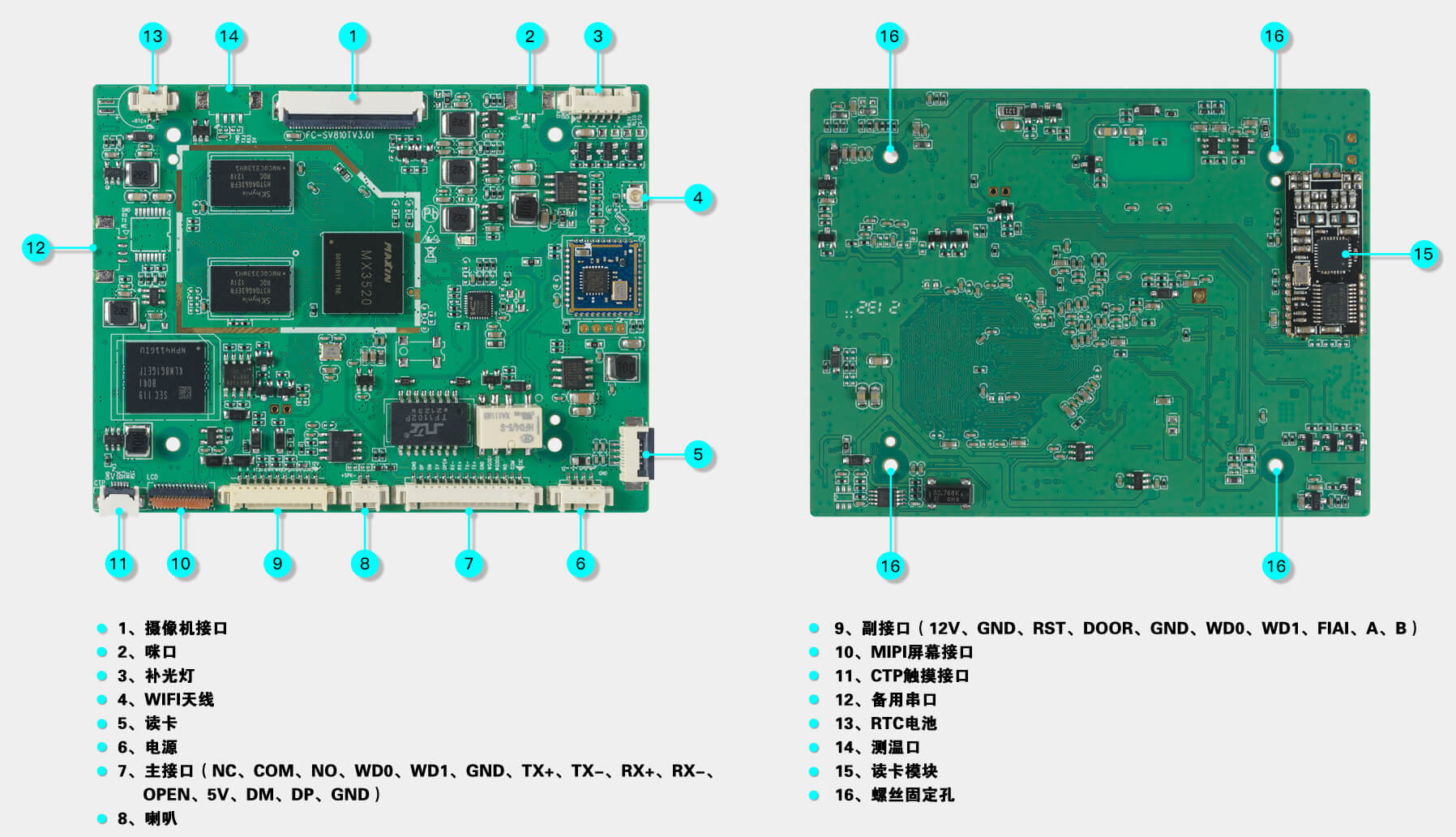 出门开关×1、门磁接口×1、消防输入×1、报警输出×1、Wiegand输出×1、Wiegand输入×1、门锁控制×1、USB×1、RS485×1