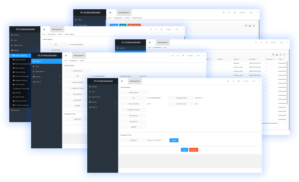 Face, Palm Vein, Fingerprint, Password, Mifare Card