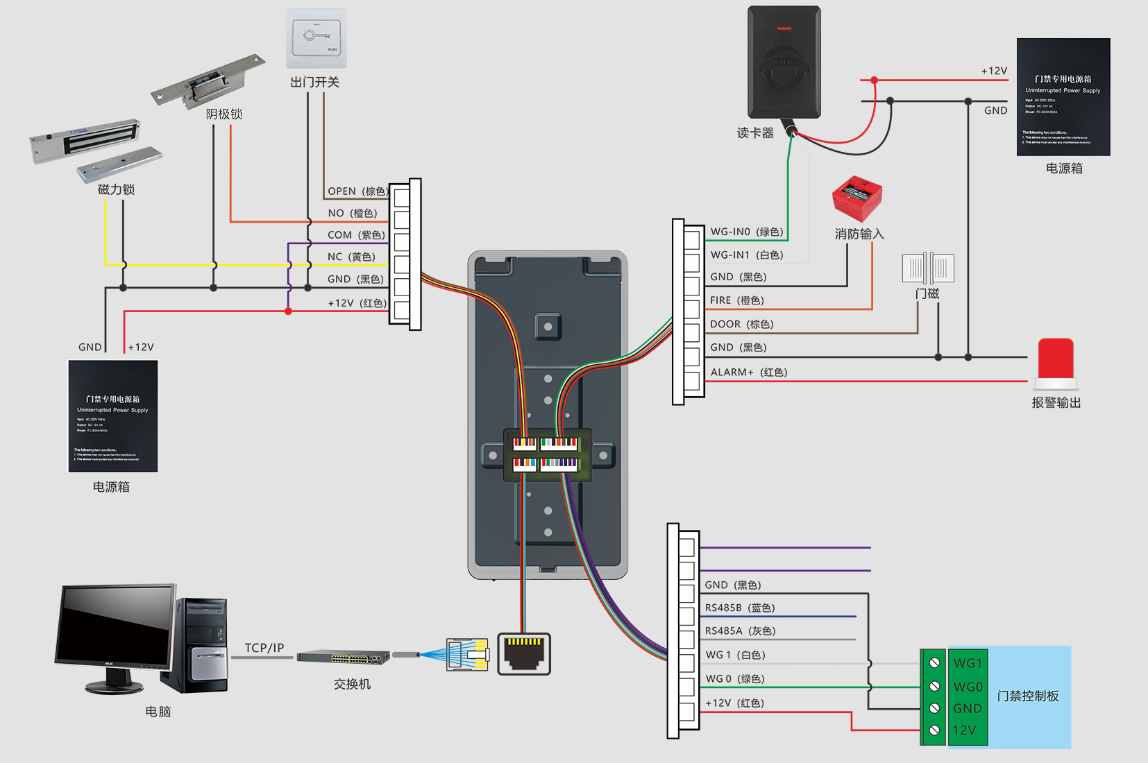 出门开关×1、门磁接口×1、消防输入×1、报警输出×1、Wiegand输出×1、Wiegand输入×1、门锁控制×1、USB×1、RS485×1