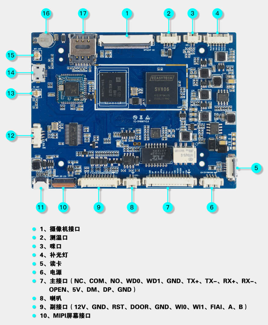 出门开关×1、门磁接口×1、消防输入×1、报警输出×1、Wiegand输出×1、Wiegand输入×1、门锁控制×1、USB×1、RS485×1
