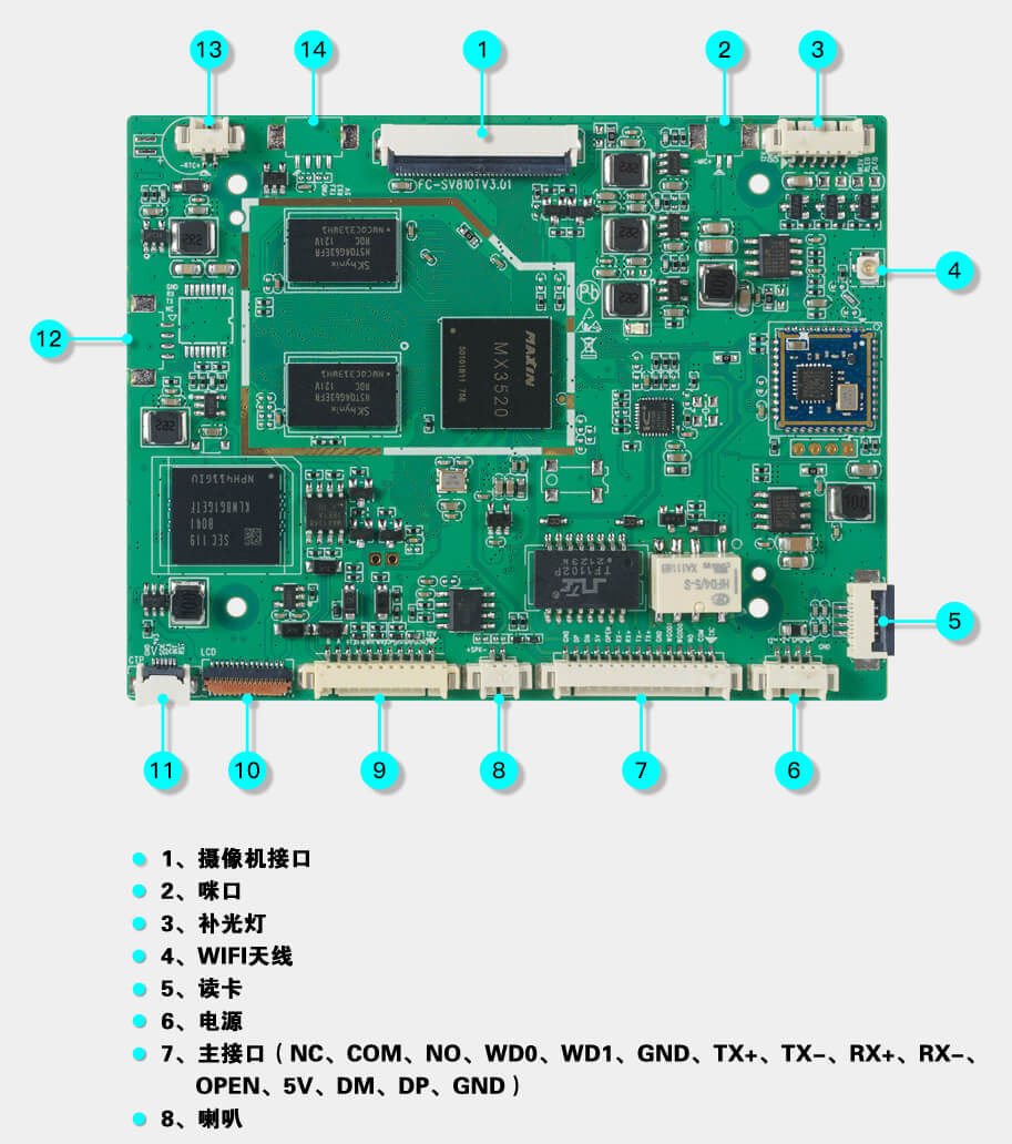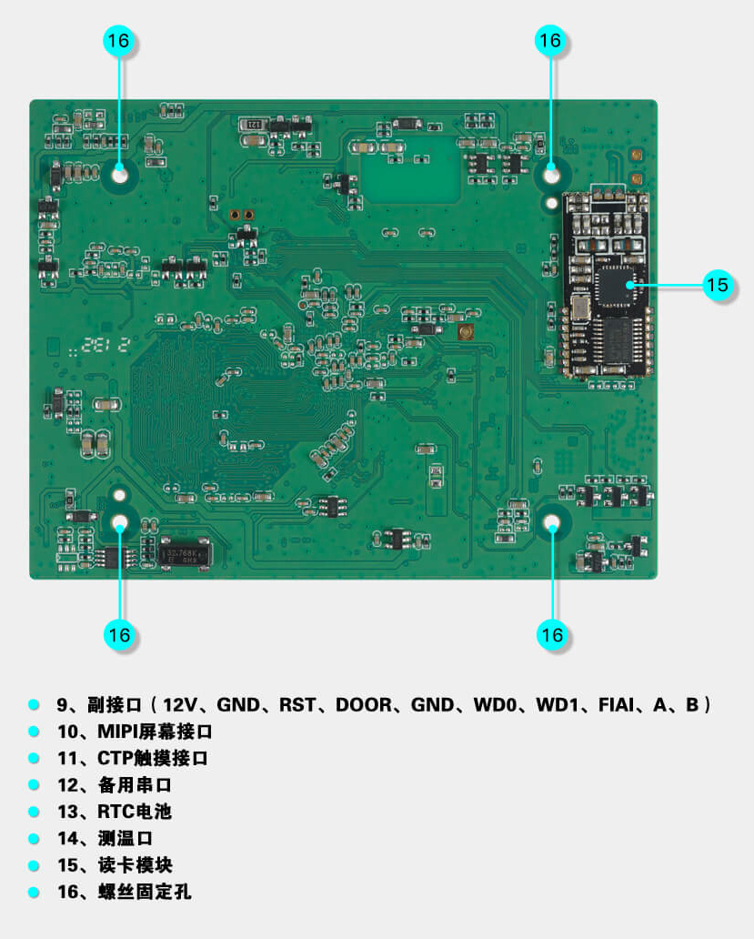 出门开关×1、门磁接口×1、消防输入×1、报警输出×1、Wiegand输出×1、Wiegand输入×1、门锁控制×1、USB×1、RS485×1