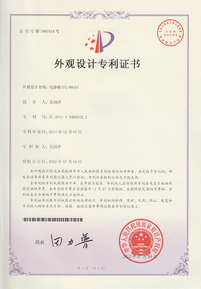 广州市英泽电子有限公司荣获由中华人民共和国国家知识产权局所颁发的“FC-8810电路板外观设计专利证书”。