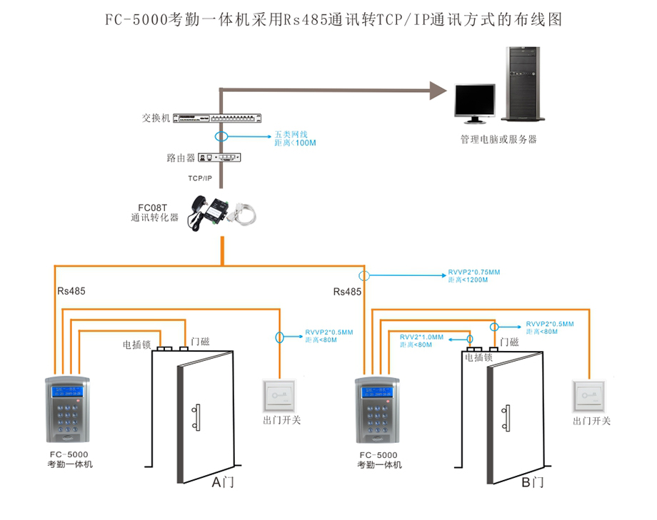 您好,感谢您采用我公司的智能考勤系列产品及对我公司的关注,为了方便您的了解,以下给您提供的就是FC-5000门禁考勤机采用Rs485通讯转TCP/IP通讯方式的布线图,给您作为参考,学习。免费电话:400-688-6663。