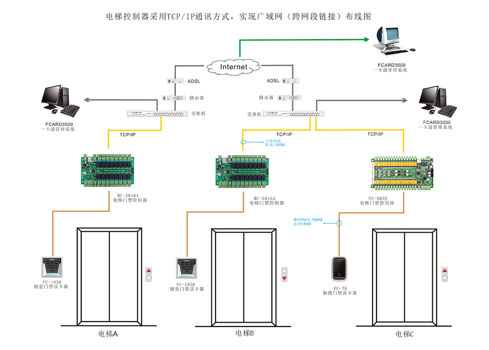 您好,请问贵公司有没有电梯门禁控制器采用TCP/IP通讯的跨网段链接布线图,在安装过程中有好多线路不懂怎么连接,可以提供一下布线图吗?谢谢!