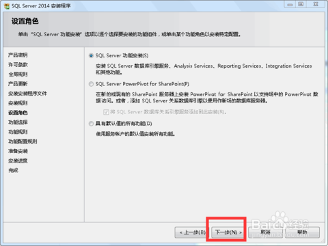 6.设置角色界面:第一个是自定义,第二个是基础功能安装,第三个是完全安装,选中你需要的功能: