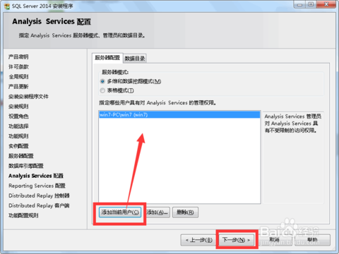 12.Analysis Services配置:这个是数据库分析功能,添加个管理员进来,然后"下一步":