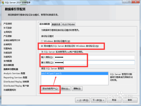 10.数据库引擎配置:首先添加一个管理员,个人电脑的话直接添加当前用户,公用的话自行设置: