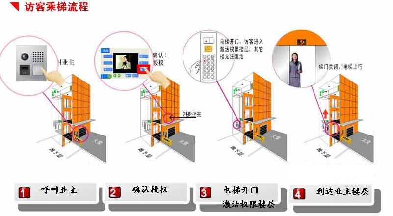 小区访客到来,在单元门按房间号,可呼叫电梯下来,访客可进电梯直达指定楼层房间。