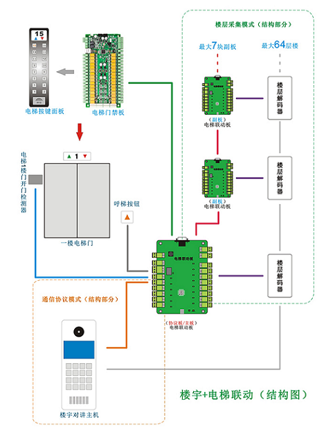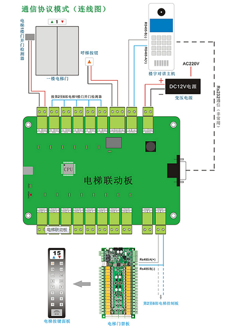 电梯联动板主要用于“楼宇对讲系统”跟“FCARD系列电梯门禁系统”之间的联合工作,主要负责收集楼宇对讲系统发来的开门与楼层信号,并转译数据交给FCARD系列电梯门禁主板,以实现接送访客至指定楼层的需求。
