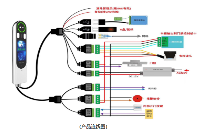 产品带一路TCP网络通讯;一路WIFI通讯;二路USB 通讯,一路接鼠标或者U盘,一路接身份证模块;一路WG输入;一路WG 输出;一路门禁或者闸机信号控制;支持定时响铃和黑名单报警功能;支持屏幕休眠、屏保以及定时重启功能,降低非使用时间的功耗。