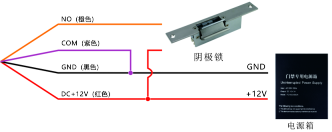 阴极锁或电控锁(通电开门型电锁):电锁负极接到人脸机NO(橙色线),电锁正极接到人脸机DC+12V(红色线),然后人脸机COM(紫色线)与GND(黑色线)并接到一起。
