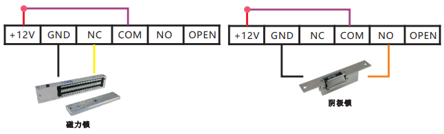 磁力锁或电插锁(通电关门型电锁):电锁的正极接到人脸机NC(黄色线),电锁的负极接到人脸机GND(黑色线),然后人脸机COM(紫色线)和+12V(红色线)并接到一起。