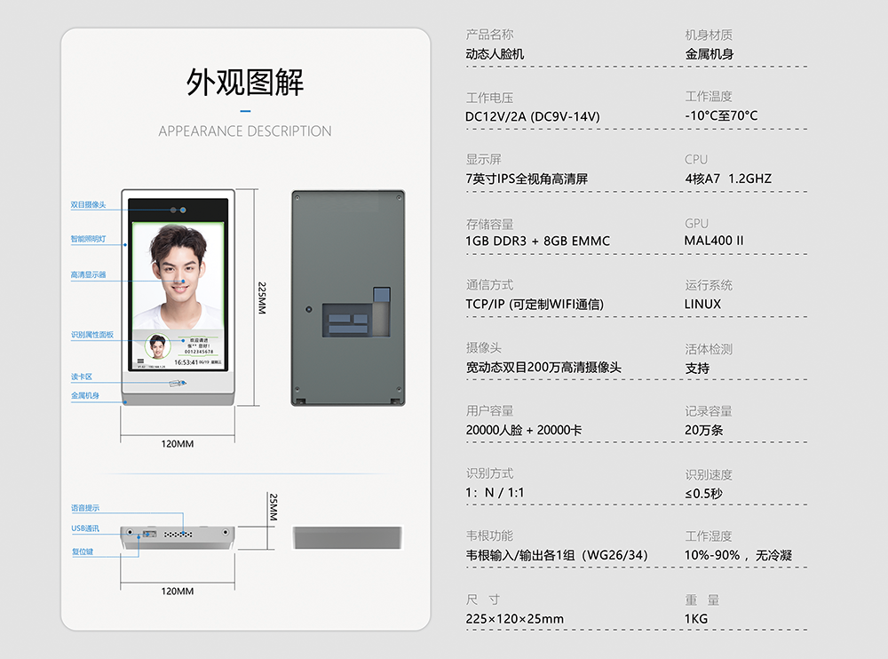 您好,欢迎使用我们的产品,谢谢您的支持。以下是FC-8200T与FC-8300T人脸机的外观尺寸和技术参数图: