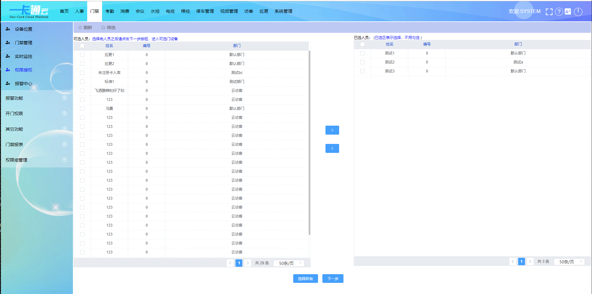 最后,在‘门禁’模块中‘权限授权’菜单,选择需要授权人脸权限的人员至右边框,点击‘下一步’