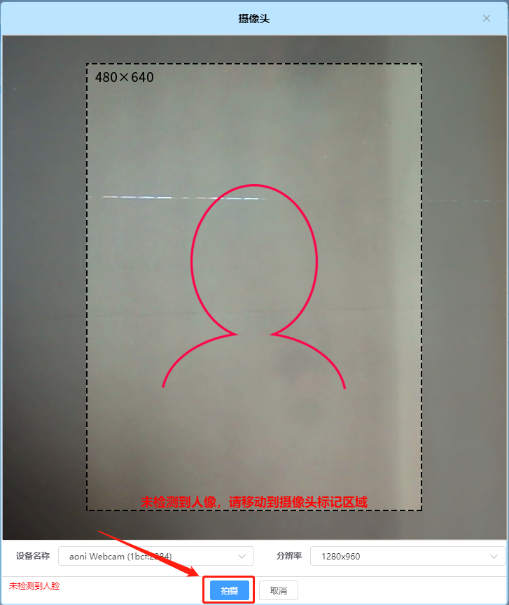 点击【拍摄】,打开【摄像头】页面,将人脸移动到红框中,点击【拍摄】。如下图2-5所示: