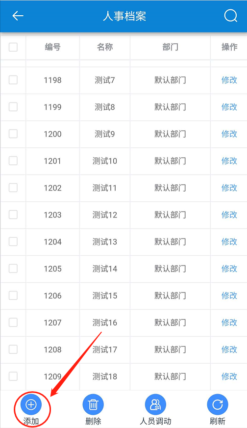 点击【人事】-【人事档案】-点击【添加】。如下图所示: