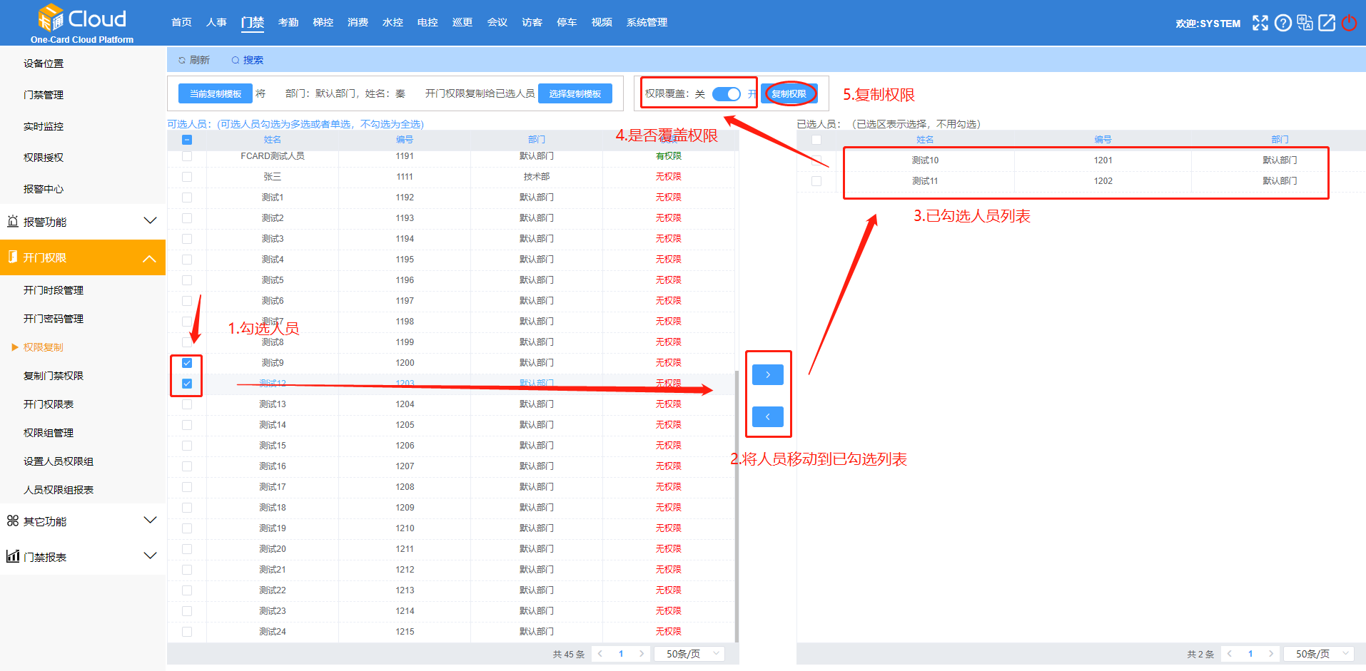 点击【门禁】-【开门权限】-【权限复制】-【选择权限模板】-选择一个人员作为复制模板-点击【确定】。如图16-1所示:
