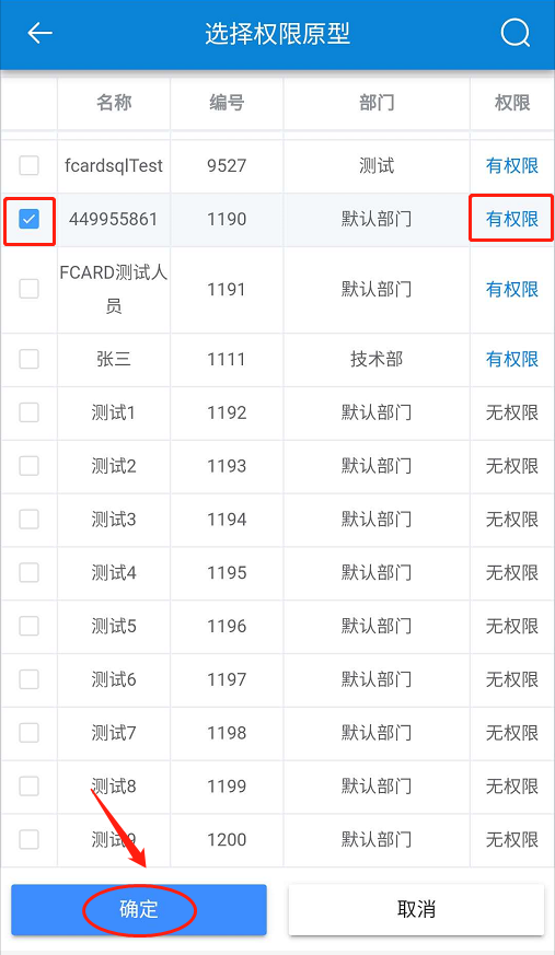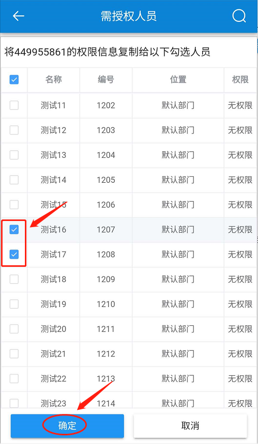 在【选择权限原型】页面,选择一个有权限人员作为复制模板-在【需授权人员】页面,选择人员-点击【确定】-选择【权限设置】-点击【确定】。如下图所示: