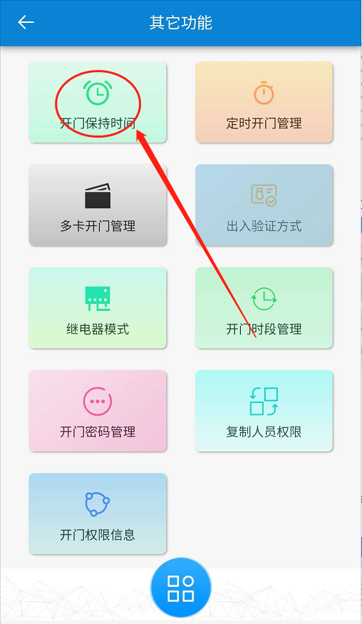 点击【门禁】-【其它功能】-【开门保持时间】。如下图所示: