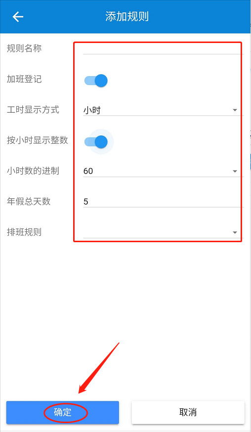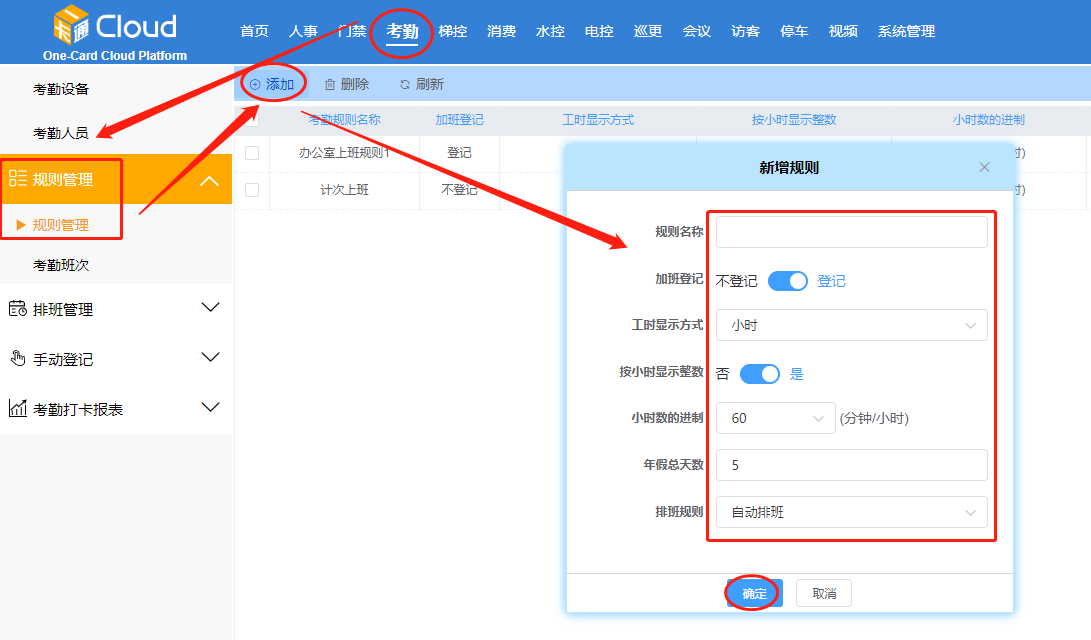 点击【考勤】-【考勤规则】-【添加】-设置考勤规则参数-点击【确定】。如下图所示: