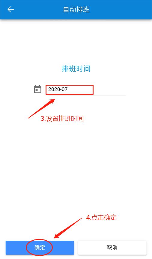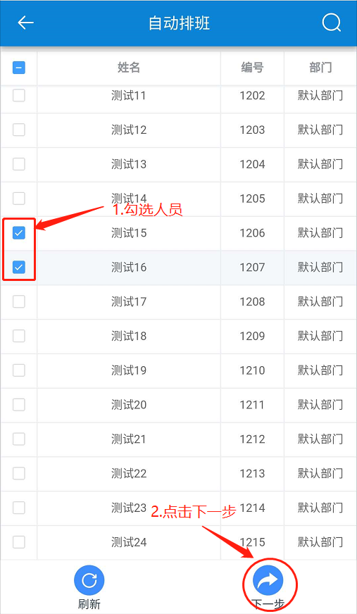 在【自动排班】页面,勾选人员-点击【下一步】-设置【排班时间】-点击【确定】。如下图所示: