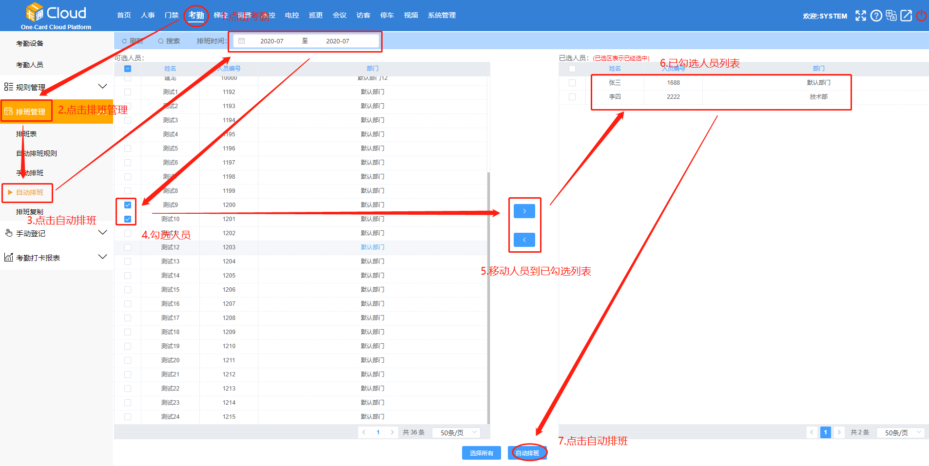 点击【考勤】-【排班管理】-【自动排班】-勾选人员-点击【自动排班】。如图27-1所示: