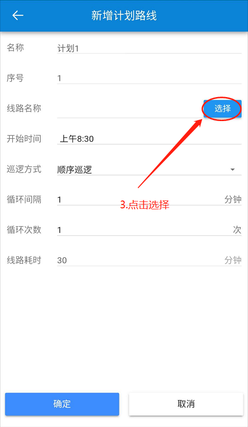 回到【新增计划路线】页面,设置开始时间、巡逻方式、循环间隔、循环次数、线路耗时-点击【确定】进入【巡更计划选择】页面,勾选线路-点击【确定】。如下图所示: