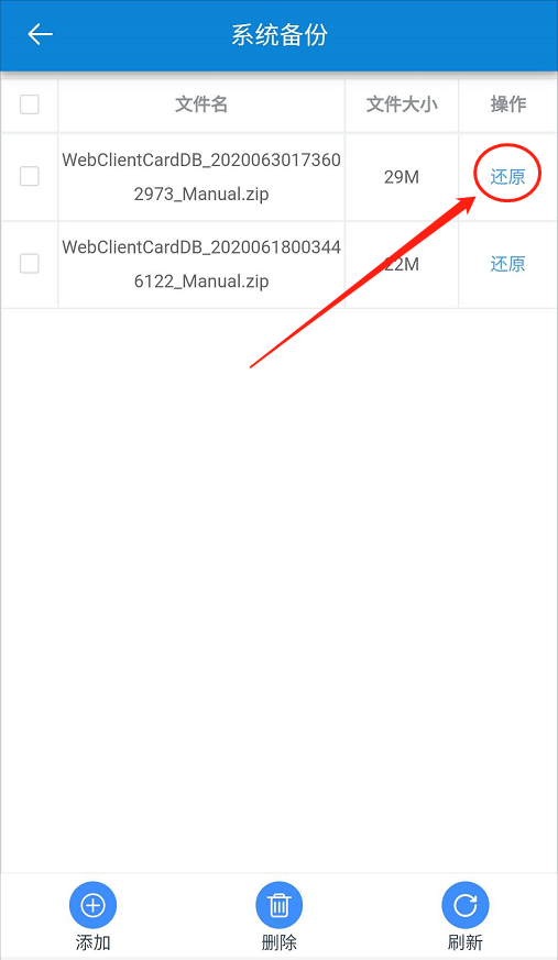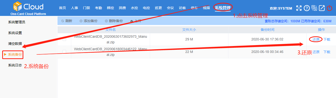 点击【系统管理】-【系统备份】-【还原】。如下图所示: