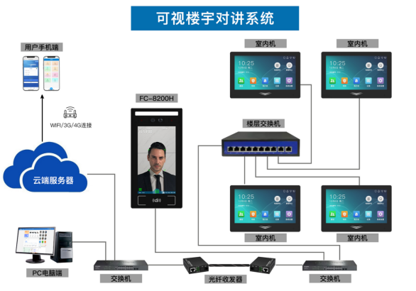 FCARD人脸可视对讲设备由人脸可视门禁机、可视室内机、门禁电源、电锁、开关、交换机、门禁发卡器等组成。