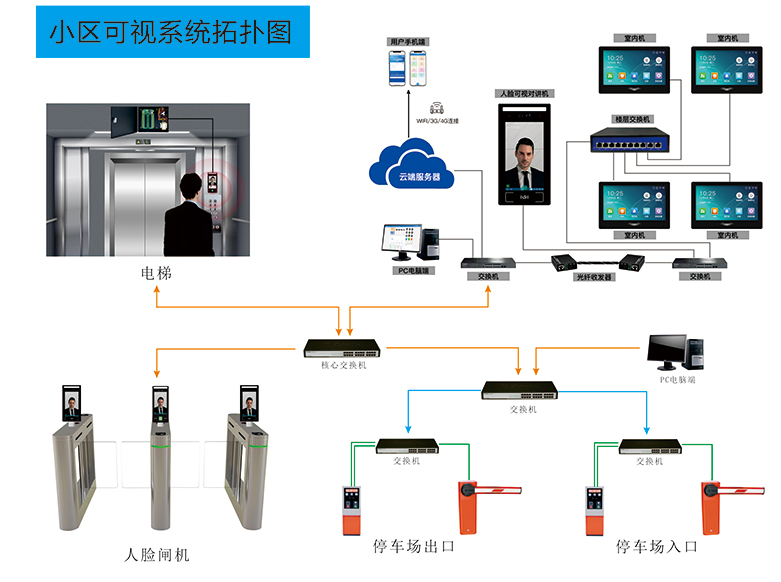 人脸可视设备连接,控制人员随意进出,住户直接人脸识别进出闸机,外来人访客可以呼叫住户或管理中心开闸进出,可以和电梯实现联动接梯功能。
