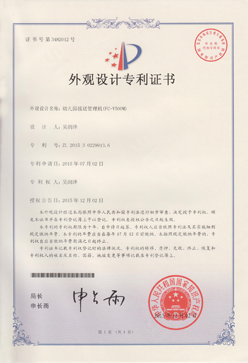 Congratulations that Guangzhou Fcard Electronics Co.,Ltd was awarded "FC-Y500M Kindergarten Access Controller - Desin Patent Certificate" which issued by State Intellectual Property Office.