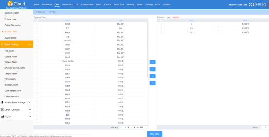 Third, in the ‘authorization’ menu of the ‘access control’ module, select the person who needs to authorize the face access level to the right frame, and click ‘Next’