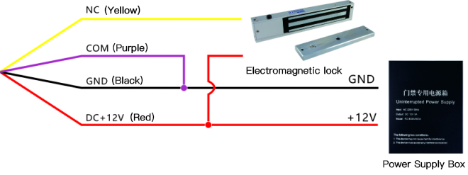 Magnetic lock or electric bolt lock (closed door type electric lock when power on): The negative electrode of the electric lock is connected to the face recognition access controller NC (yellow wire), the positive electrode of the electric lock is connected to the face recognition access controller DC+12V (red wire), and then the face recognition access controller COM ( Purple wire) and GND (black wire) are connected in parallel.