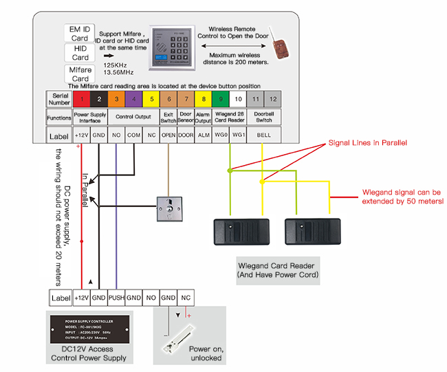 Hello, FC-198E access controller supports external Wiegand 26 card readers (up to two can be connected, the line can be extended by 15 meters), you can achieve this by the following methods: