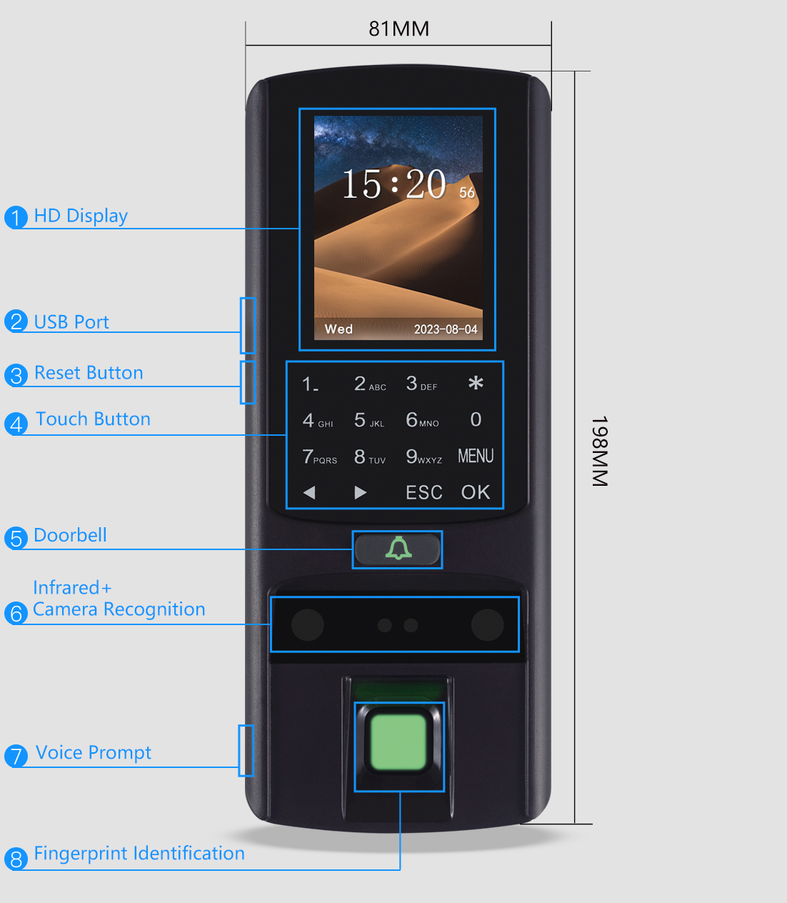 • 1,000 Users(5,000 Fingerprints, 1,000 Cards, 1,000 Passwords)