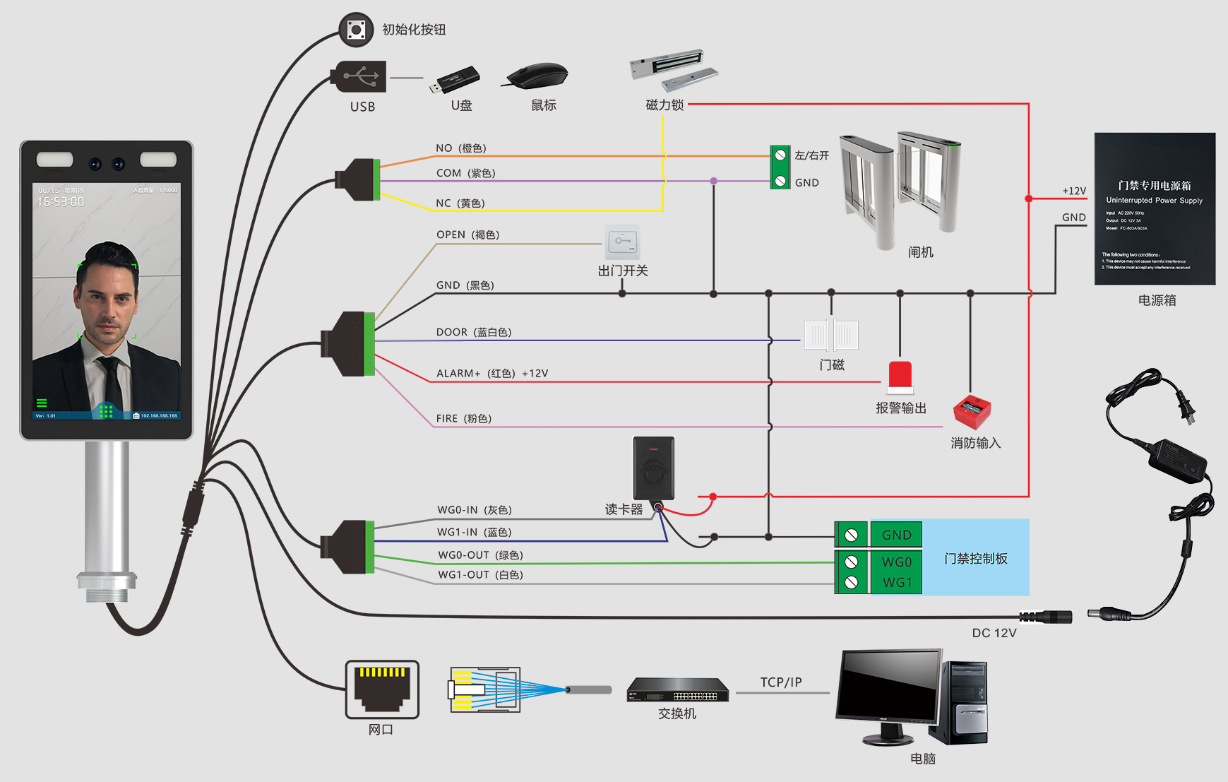 出门开关×1、门磁接口×1、消防输入×1、报警输出×1、Wiegand输出×1、Wiegand输入×1、门锁控制×1、USB×1、RS485×1