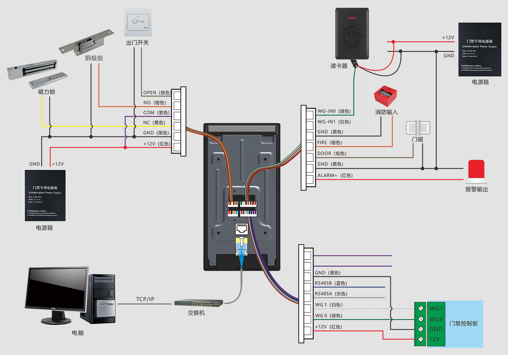 出门开关×1、门磁接口×1、消防输入×1、报警输出×1、Wiegand输出×1、Wiegand输入×1、门锁控制×1、USB×1、RS485×1