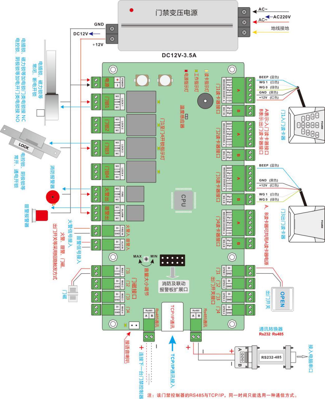 其它信号接入接口: 每个门提供1组出门开门接口、1组门磁开门接口、每台控制器提供1组消防联动接口、1组匪警报警联动接口