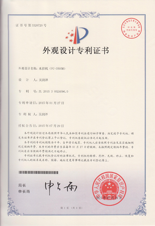 Congratulations that Guangzhou Fcard Electronics Co.,Ltd was awarded the "FC-3505M Water Controller-Design Patent Certificate"