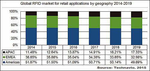 "global RFID application retail market in 2015-2019" reported that the market take apart to three main areas.In 2014, 52% for America, 37% for Europe, about 37% Middle East and Africa (EMEA) , about 11% (APAC) in the Asia-pacific region.