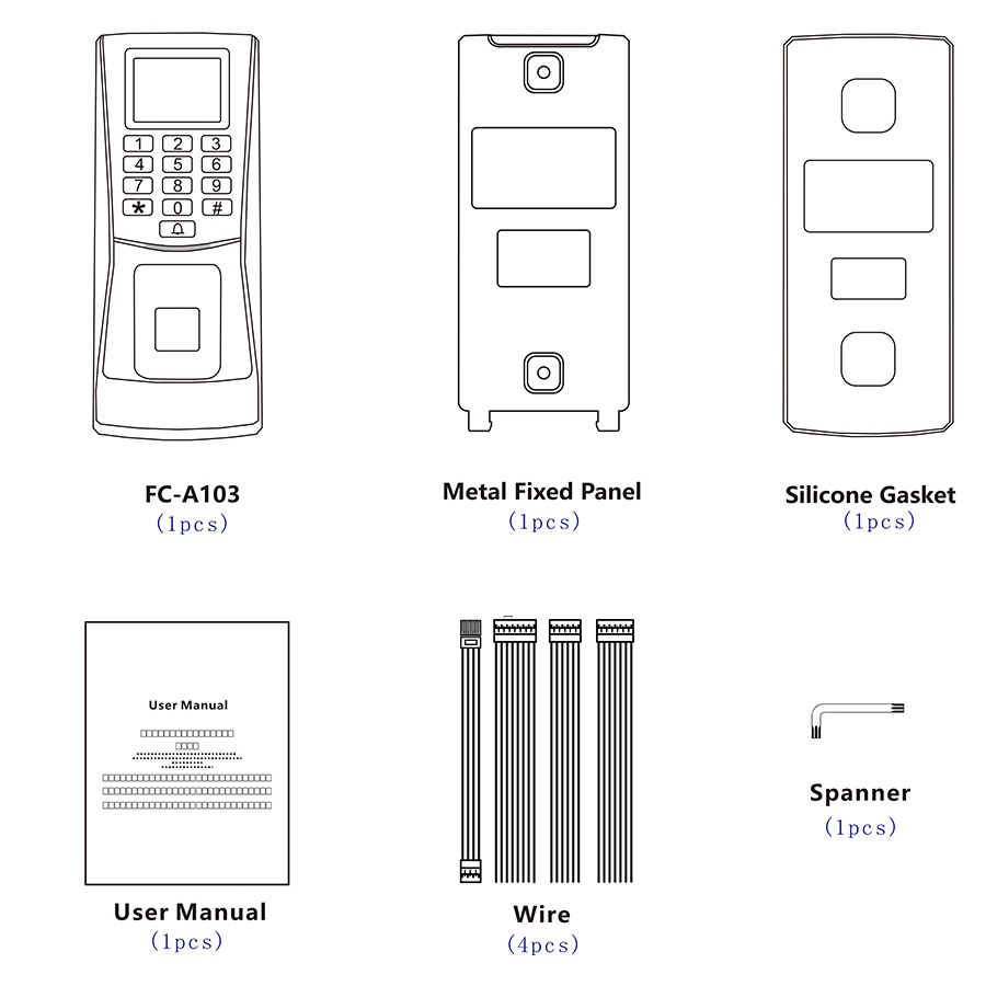 FC-A103 is a Fingerprint access controller, support network and standalone running. It uses multi-core ARM processor, mass memory. Built-in fingerprint identification circuit, support high-speed identification and rejection of false fingerprints. Fingerprint identification time < 1S, using 1.8 inch TFT color screen, support 1000 fingerprints, 1000 cards, 1000 passwords, 100,000 records, (Can be customized to support ID card or Mifare card), TCP/IP and RS485, support 1 group of unlock relay, 1 group of door sensor, 1 group of alarm output, can use U disk to backup data, support cloud platform. Simplified Chinese, English (other languages can be customized)