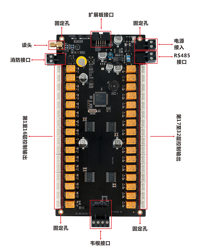 The biggest feature of FC-2864M elevator access control biard is to run offline, open the door by reading card, open the door with password, remotely open the door, remotely close the door, time period normally open, real-time monitoring, abnormality, monitoring, fire linkage, illegal card reading alarm, report lost card, Blacklist card reading alarm, batch upload, small upload, keyboard operation, emergency door closing, 64 groups of door opening hours, holidays, card return, record restoration, anti-detection lock, card reading verification, Mifare card data writing, card issuing, call after alarm Connection notification, the number of days the device has been running, and remote hardware program upgrades. In addition to the above functions, we also add new technologies to the FC-2864M series access control boards that are not or rare in other similar products on the market: such as input power stability monitoring, products trial period, smart clock error self-correction every day, card reading interval setting, communication encryption data, card valid times, capacity self-expansion, Wiegand keyboard issuance and other new functions.